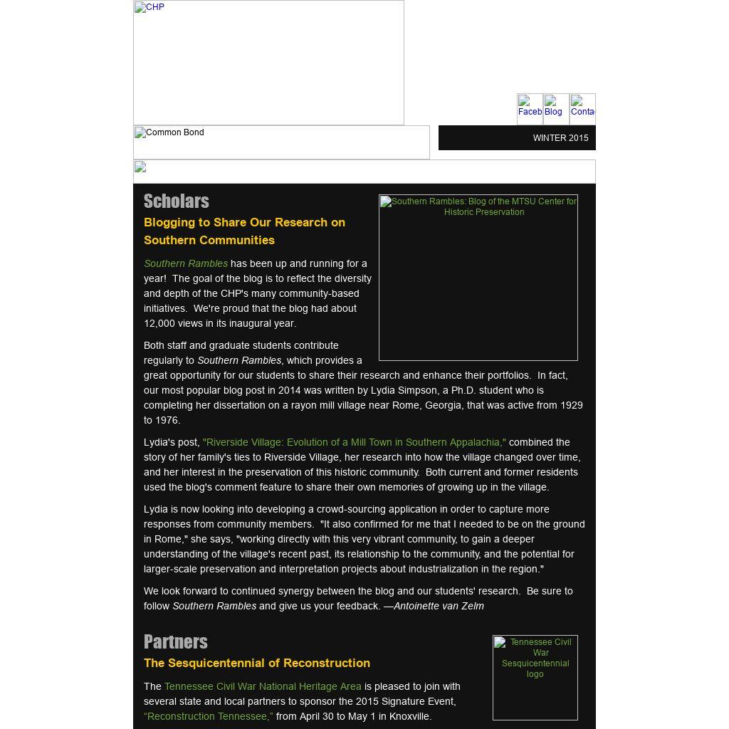 © Copyright 2015, Center for Historic Preservation, Middle Tennessee State University, a Tennessee Board of Regents institution. Box 80, 1301 East Main Street, Murfreesboro, TN 37132 USA 1-615-898-2947