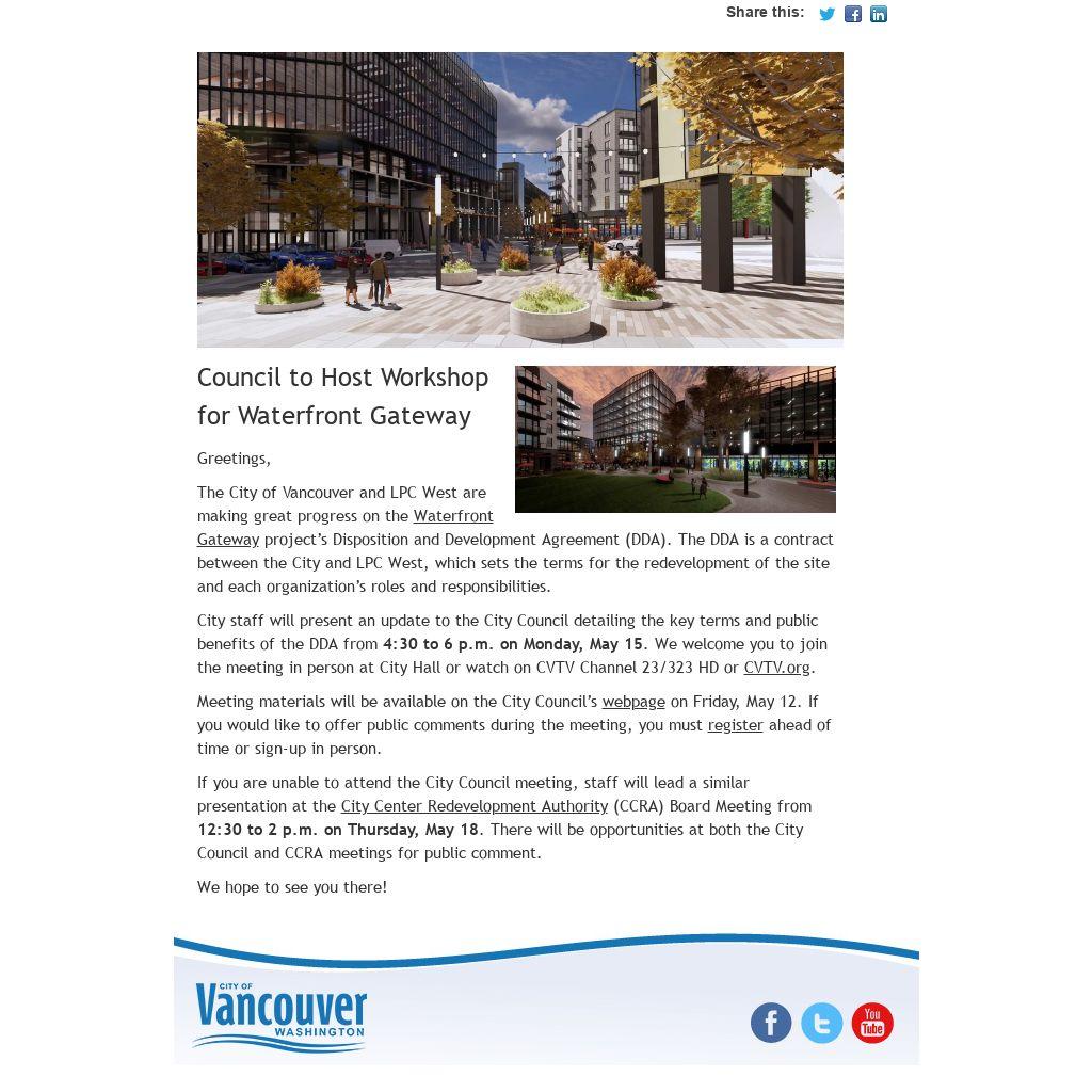 If you are unable to attend the City Council meeting, staff will lead a similar presentation at the City Center Redevelopment Authority (CCRA) Board Meeting from 12:30 to 2 p.m. on Thursday, May 18. There will be opportunities at both the City Council and CCRA meetings for public comment.