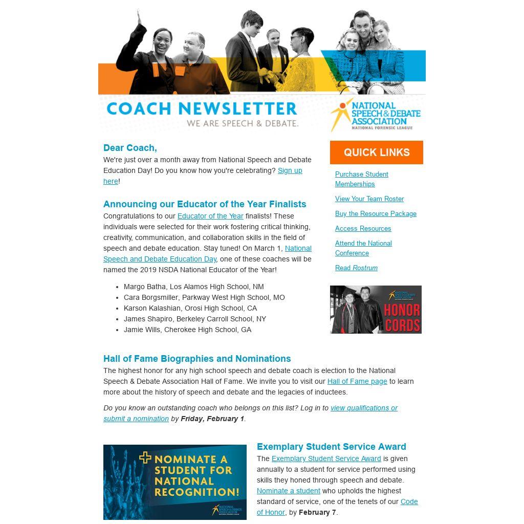 Hall of Fame Biographies and Nominations The highest honor for any high school speech and debate coach is election to the National Speech & Debate Association Hall of Fame. We invite you to visit our Hall of Fame page to learn more about the history of speech and debate and the legacies of inductees.