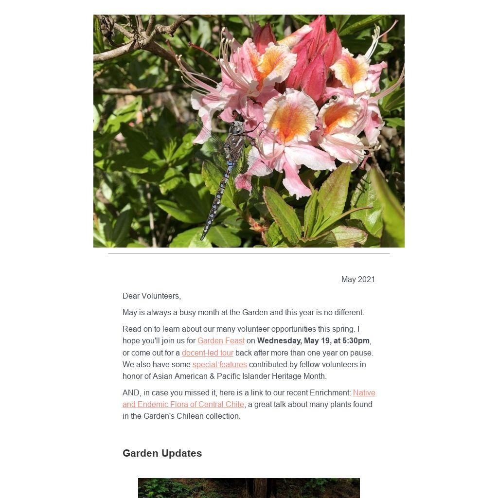 Read on to learn about our many volunteer opportunities this spring. I hope you'll join us for Garden Feast on Wednesday, May 19, at 5:30pm, or come out for a docent-led tour back after more than one year on pause. We also have some special features contributed by fellow volunteers in honor of Asian American & Pacific Islander Heritage Month.