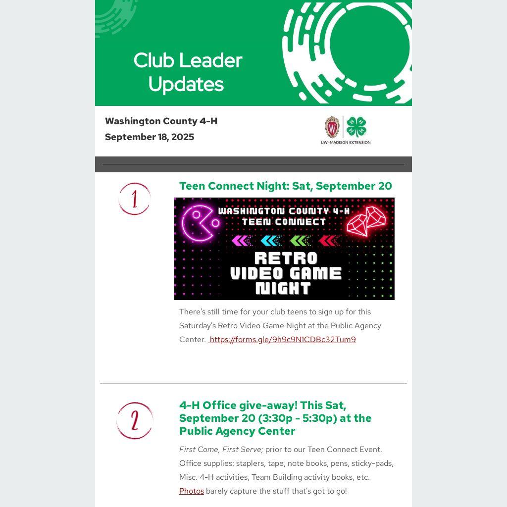 | 4-H Office give-away! This Sat, September 20 (3:30p - 5:30p) at the Public Agency Center |