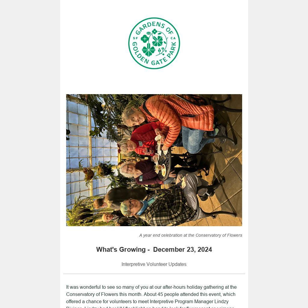 It was wonderful to see so many of you at our after-hours holiday gathering at the Conservatory of Flowers this month. About 45 people attended this event, which offered a chance for volunteers to meet Interpretive Program Manager Lindzy Bivings. Lindzy had her UV flashlight on hand to look for fluorescent specimens, including some dramatic pitcher plants, while the Conservatory’s winter light show, Photosynthesis: Love for All Seasons, and fabulous soundtrack added to the ambiance.