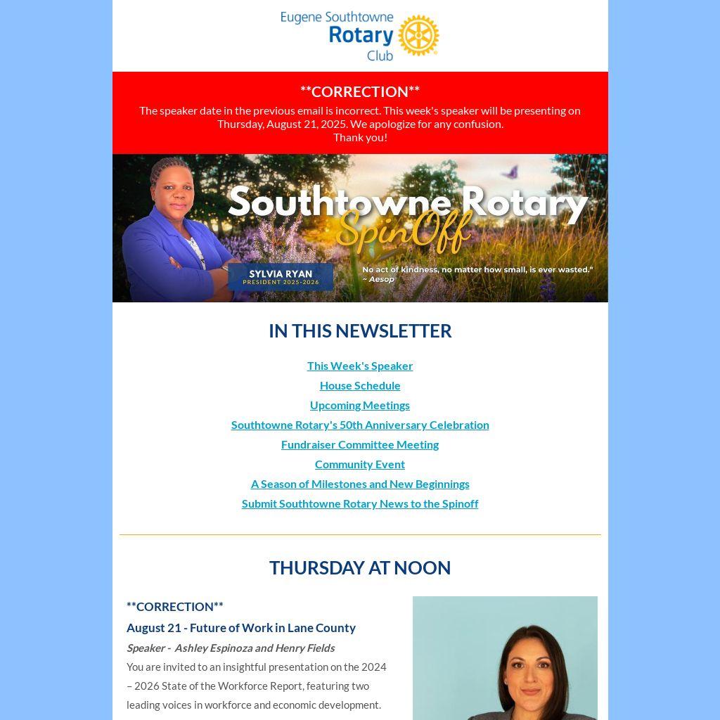 The speaker date in the previous email is incorrect. This week's speaker will be presenting on Thursday, August 21, 2025. We apologize for any confusion.