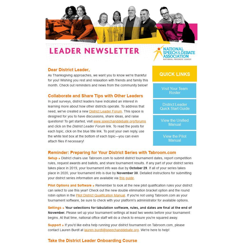 Setup » District chairs use Tabroom.com to submit district tournament dates, report competition rules, request awards and ballots, and share tournament results. If any part of your district series takes place in 2019, your tournament info was due by October 29. If all of your series takes place in 2020, your tournament info is due by November 30. Detailed instructions for submitting your district series information are available via this guide.