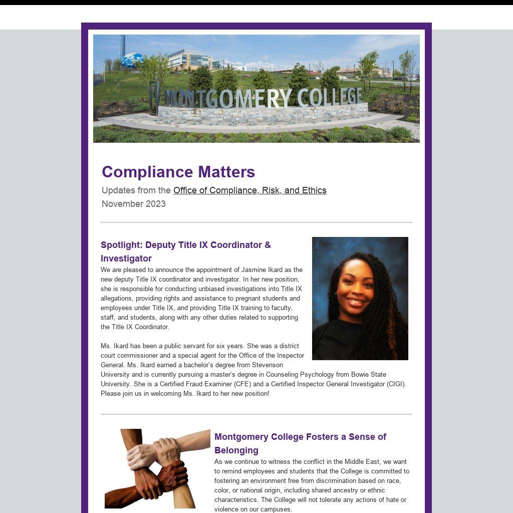 We are pleased to announce the appointment of Jasmine Ikard as the new deputy Title IX coordinator and investigator. In her new position, she is responsible for conducting unbiased investigations into Title IX allegations, providing rights and assistance to pregnant students and employees under Title IX, and providing Title IX training to faculty, staff, and students, along with any other duties related to supporting the Title IX Coordinator.