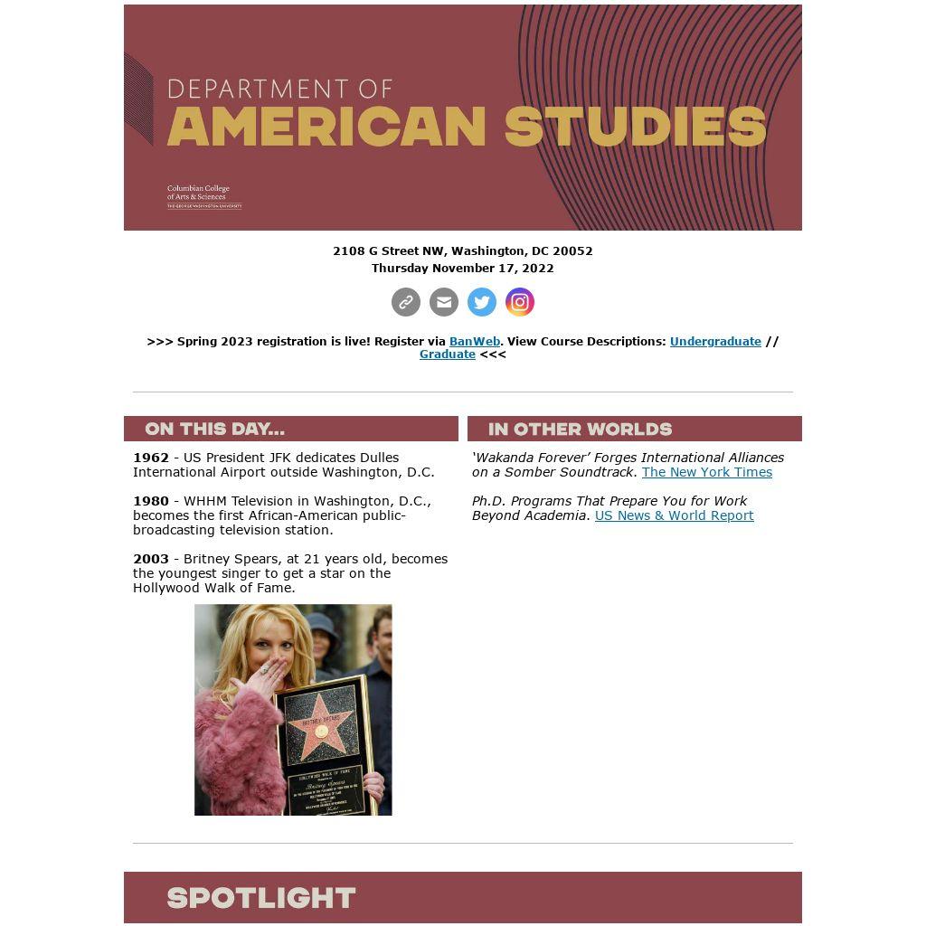 While it’s been quite some time since you’ve heard from us, we’ve been working on reimagining our American Studies newsletter, and we’re ready to share! Delivered every other week on Thursdays, the newsletter seeks to provide useful and interesting information about the department, our world, culture, and beyond. Including fun historical facts, important current events, student and faculty opportunities, department kudos, specialized admin support, and more, the newsletter underscores all that is happening in and around GW American Studies.