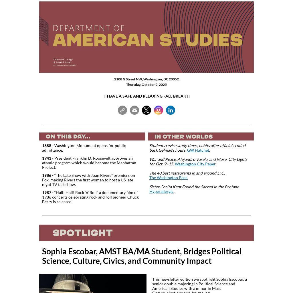 | This newsletter edition we spotlight Sophia Escobar, a senior double majoring in Political Science and American Studies with a minor in Mass Communications and Journalism.Â