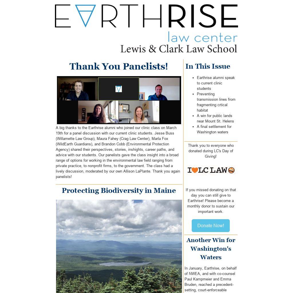 “For a substantially similar proposed transmission line through New Hampshire recently, the federal government did an Environmental Impact Statement, which allowed for robust public participation,” says Earthrise attorney Lia Comerford, who is working on the case with Kevin Cassidy. “But in Maine, the Corps and DOE chose to short circuit the environmental review process and their findings that a highly controversial project of this scope would not have significant impacts on the environment fell far short of meeting the relevant legal standard.”