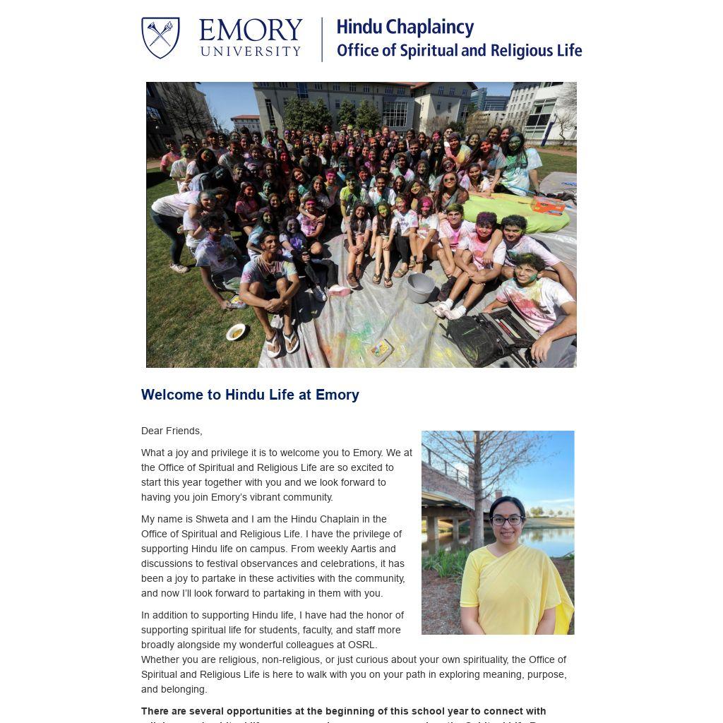 What a joy and privilege it is to welcome you to Emory. We at the Office of Spiritual and Religious Life are so excited to start this year together with you and we look forward to having you join Emory’s vibrant community.