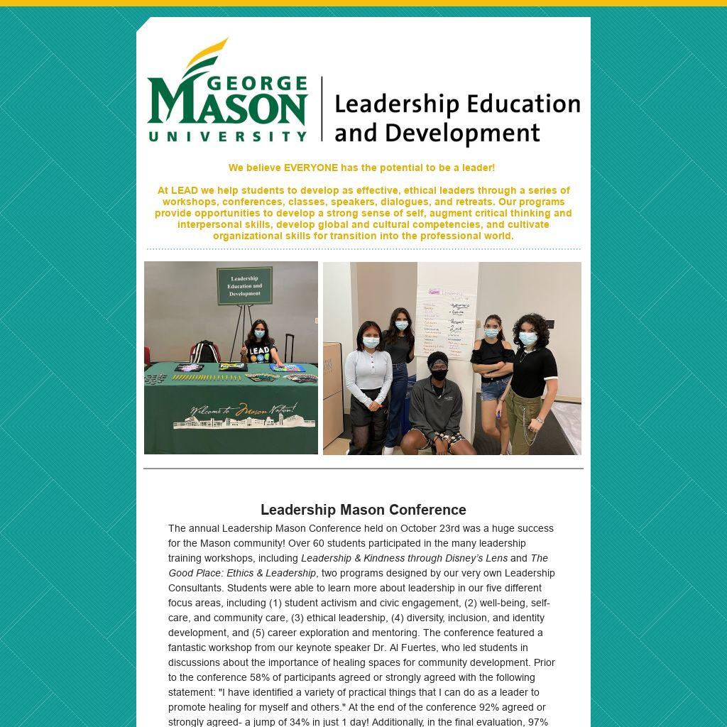 The annual Leadership Mason Conference held on October 23rd was a huge success for the Mason community! Over 60 students participated in the many leadership training workshops, including Leadership & Kindness through Disney’s Lens and The Good Place: Ethics & Leadership, two programs designed by our very own Leadership Consultants. Students were able to learn more about leadership in our five different focus areas, including (1) student activism and civic engagement, (2) well-being, self-care, and community care, (3) ethical leadership, (4) diversity, inclusion, and identity development, and (5) career exploration and mentoring. The conference featured a fantastic workshop from our keynote speaker Dr. Al Fuertes, who led students in discussions about the importance of healing spaces for community development. Prior to the conference 58% of participants agreed or strongly agreed with the following statement: "I have identified a variety of practical things that I can do as a leader to promote healing for myself and others." At the end of the conference 92% agreed or strongly agreed- a jump of 34% in just 1 day! Additionally, in the final evaluation, 97% of participants agreed or strongly agreed with the following statements: "I enjoyed the conference" and "I learned something useful at the conference." The LEAD Office is proud to have offered students the chance to strengthen and enhance their natural leadership abilities, all while engaging and connecting with the Mason community. We look forward to next year’s conference!