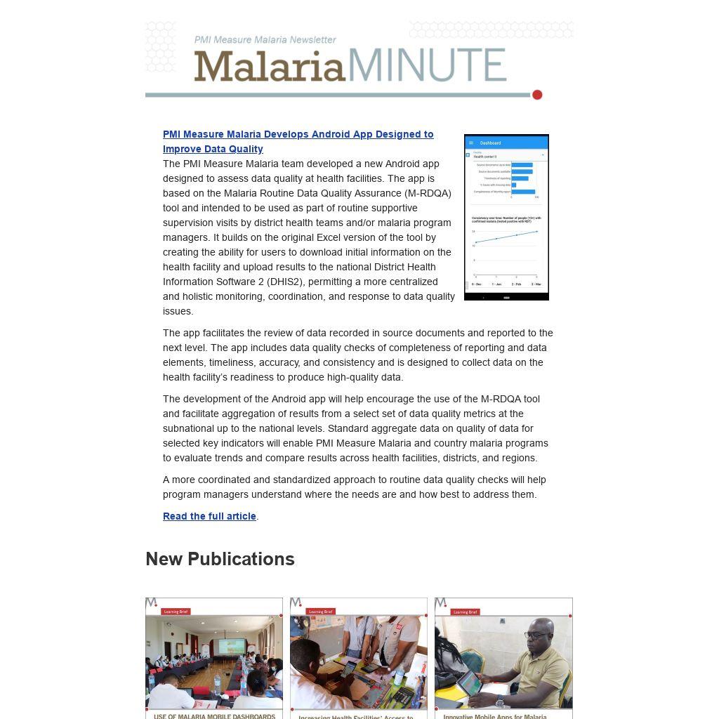 The PMI Measure Malaria team developed a new Android app designed to assess data quality at health facilities. The app is based on the Malaria Routine Data Quality Assurance (M-RDQA) tool and intended to be used as part of routine supportive supervision visits by district health teams and/or malaria program managers. It builds on the original Excel version of the tool by creating the ability for users to download initial information on the health facility and upload results to the national District Health Information Software 2 (DHIS2), permitting a more centralized and holistic monitoring, coordination, and response to data quality issues.