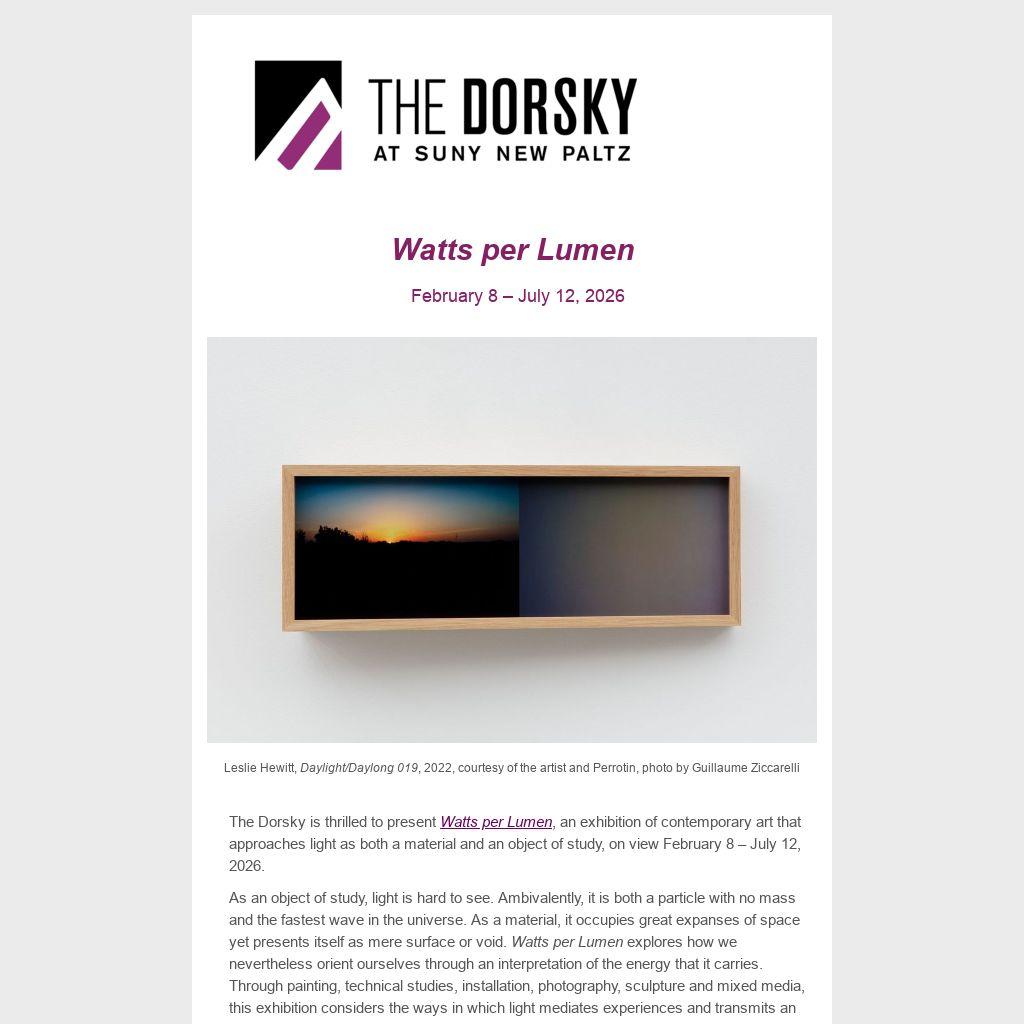 Watts per Lumen is curated by Sophie Landres, Curator and Exhibitions Manager at The Dorsky Museum.