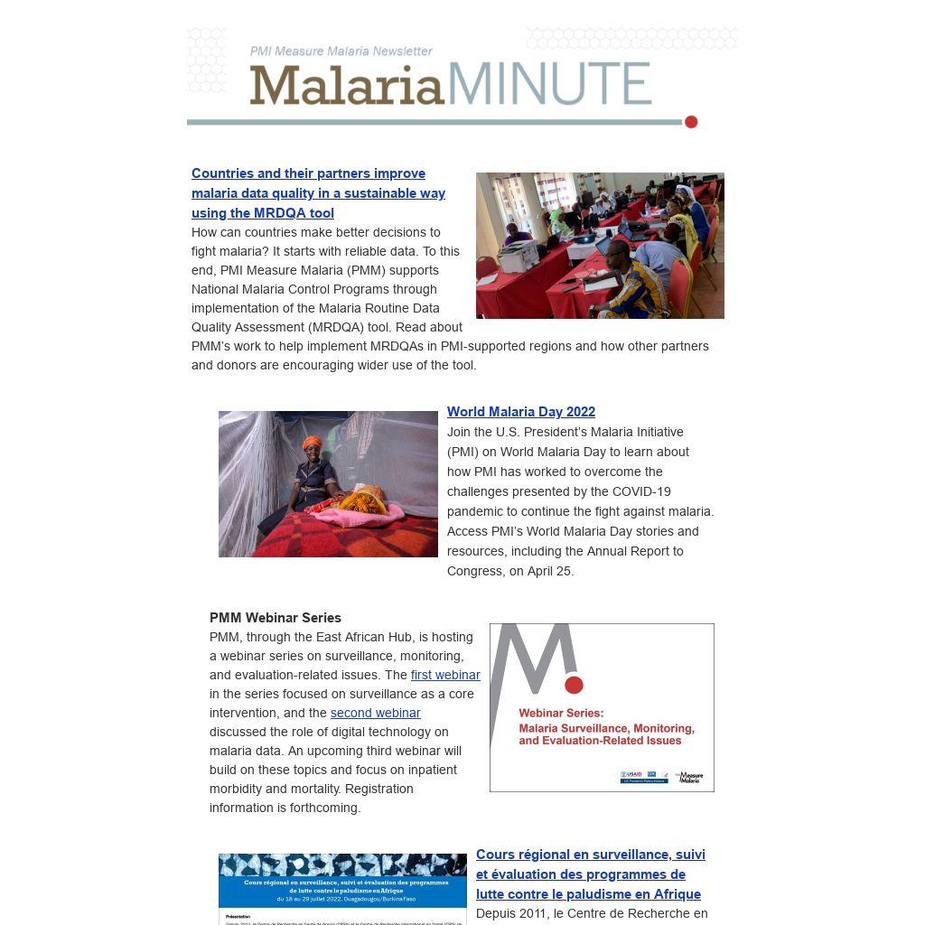 PMM Webinar Series PMM, through the East African Hub, is hosting a webinar series on surveillance, monitoring, and evaluation-related issues. The first webinar in the series focused on surveillance as a core intervention, and the second webinar discussed the role of digital technology on malaria data. An upcoming third webinar will build on these topics and focus on inpatient morbidity and mortality. Registration information is forthcoming.