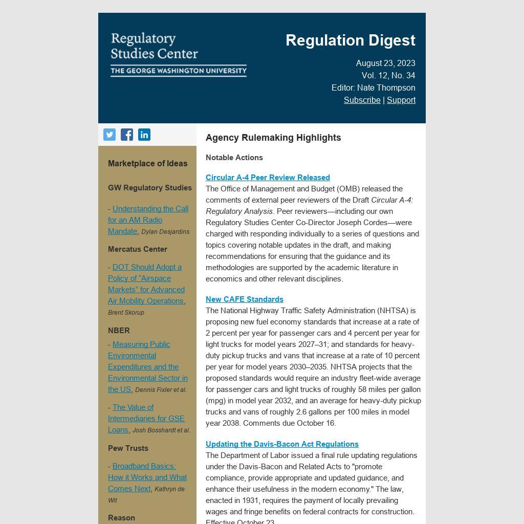 Notable ActionsCircular A-4 Peer Review Released The Office of Management and Budget (OMB) released the comments of external peer reviewers of the Draft Circular A-4: Regulatory Analysis. Peer reviewers—including our own Regulatory Studies Center Co-Director Joseph Cordes—were charged with responding individually to a series of questions and topics covering notable updates in the draft, and making recommendations for ensuring that the guidance and its methodologies are supported by the academic literature in economics and other relevant disciplines.
