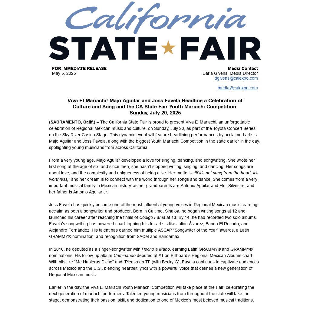 “Viva El Mariachi isn’t just a concert, it’s a cultural celebration,” said Tom Martinez, CEO of California Exposition & State Fair. “We’re proud to showcase talent like Majo Aguilar and Joss Favela, while also lifting up the next generation of mariachi musicians through our youth competition. This is what the Fair is all about, celebrating talent, heritage, and community.”