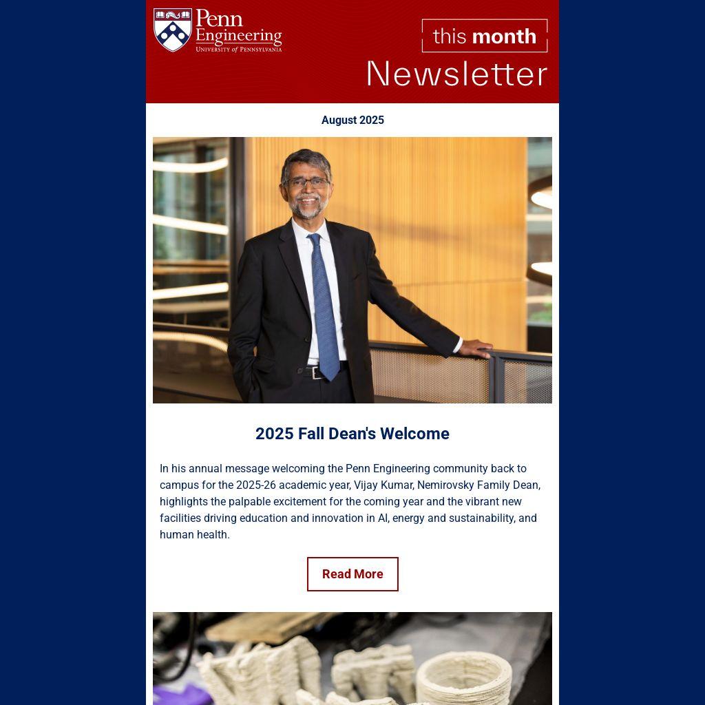 In his annual message welcoming the Penn Engineering community back to campus for the 2025-26 academic year, Vijay Kumar, Nemirovsky Family Dean, highlights the palpable excitement for the coming year and the vibrant new facilities driving education and innovation in AI, energy and sustainability, and human health.