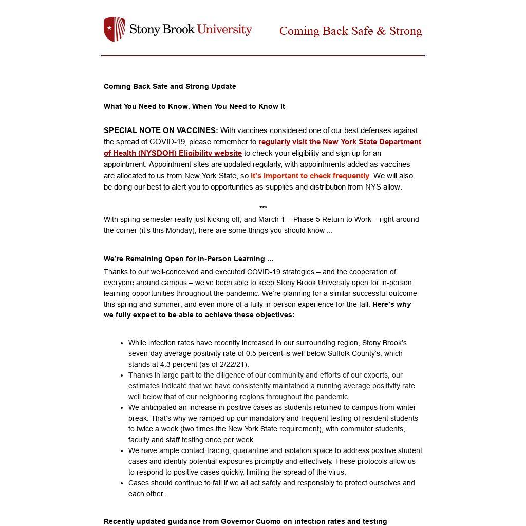 Thanks to our well-conceived and executed COVID-19 strategies – and the cooperation of everyone around campus – we’ve been able to keep Stony Brook University open for in-person learning opportunities throughout the pandemic. We’re planning for a similar successful outcome this spring and summer, and even more of a fully in-person experience for the fall. Here’s why we fully expect to be able to achieve these objectives: