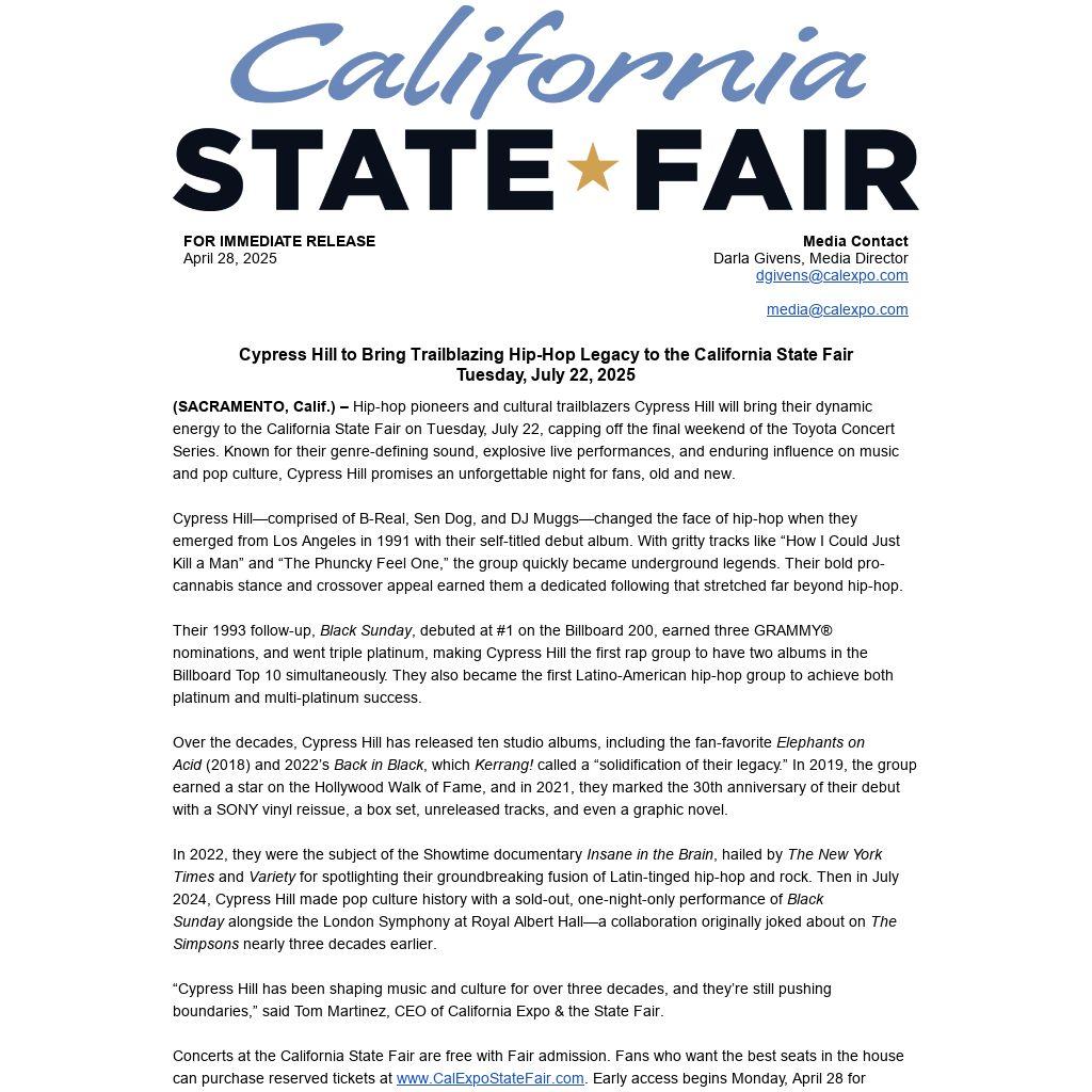 “Cypress Hill has been shaping music and culture for over three decades, and they’re still pushing boundaries,” said Tom Martinez, CEO of California Expo & the State Fair.
