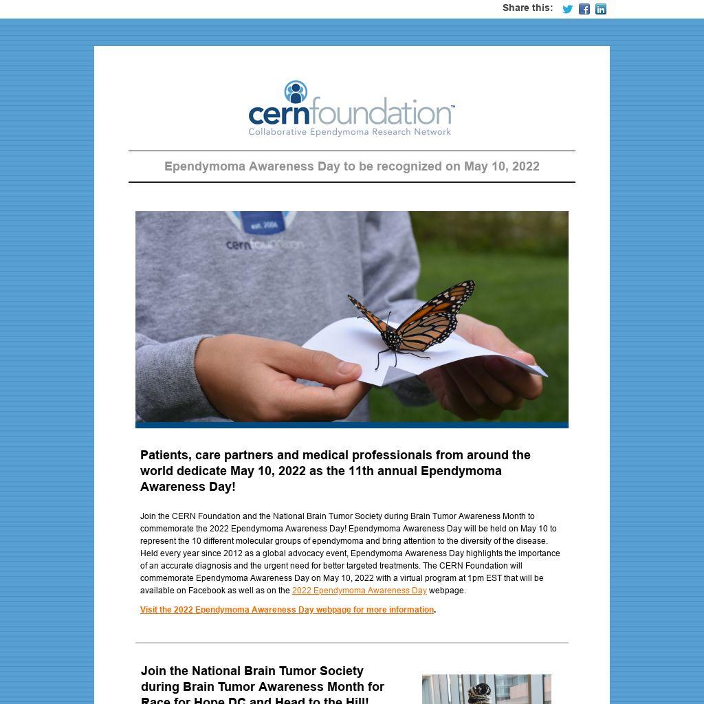 To kick off brain tumor awareness month (BTAM), the Head to the Hill Welcome Reception on Sunday, May 1, 2022 will include the CERN Foundation butterfly release and ceremony taking place in Bethesda, MD. Local ependymoma families are invited to join the Welcome Reception that will include the CERN Foundation butterfly release. You must