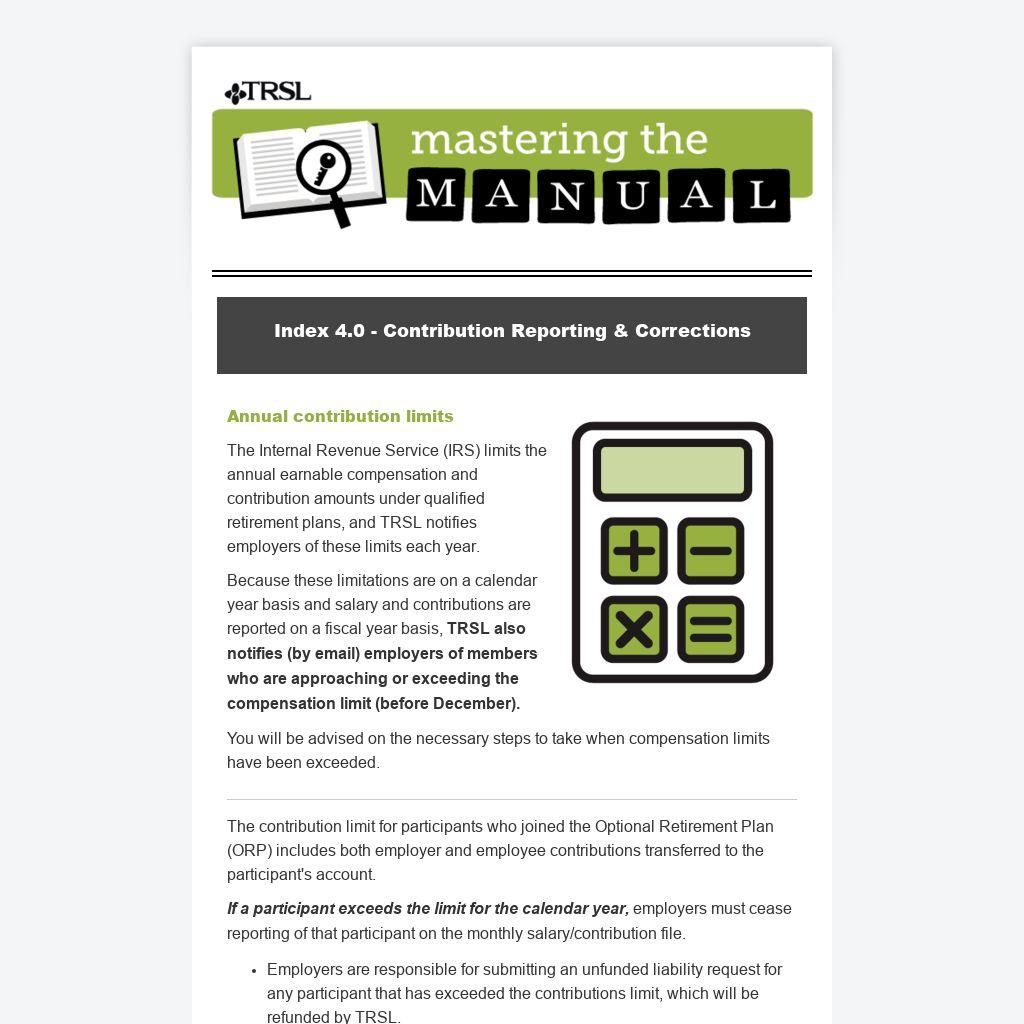 Because these limitations are on a calendar year basis and salary and contributions are reported on a fiscal year basis, TRSL also notifies (by email) employers of members who are approaching or exceeding the compensation limit (before December).