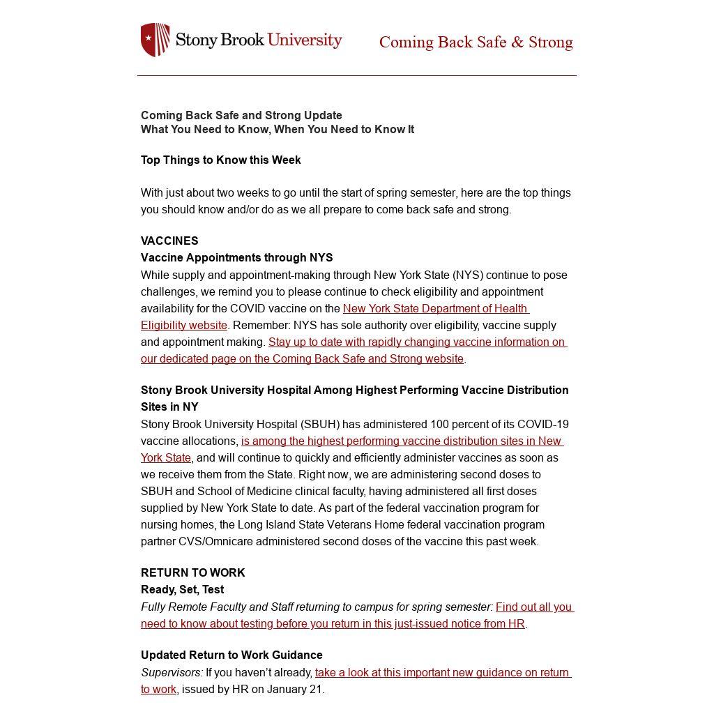 Stony Brook University Hospital (SBUH) has administered 100 percent of its COVID-19 vaccine allocations, is among the highest performing vaccine distribution sites in New York State, and will continue to quickly and efficiently administer vaccines as soon as we receive them from the State. Right now, we are administering second doses to SBUH and School of Medicine clinical faculty, having administered all first doses supplied by New York State to date. As part of the federal vaccination program for nursing homes, the Long Island State Veterans Home federal vaccination program partner CVS/Omnicare administered second doses of the vaccine this past week.