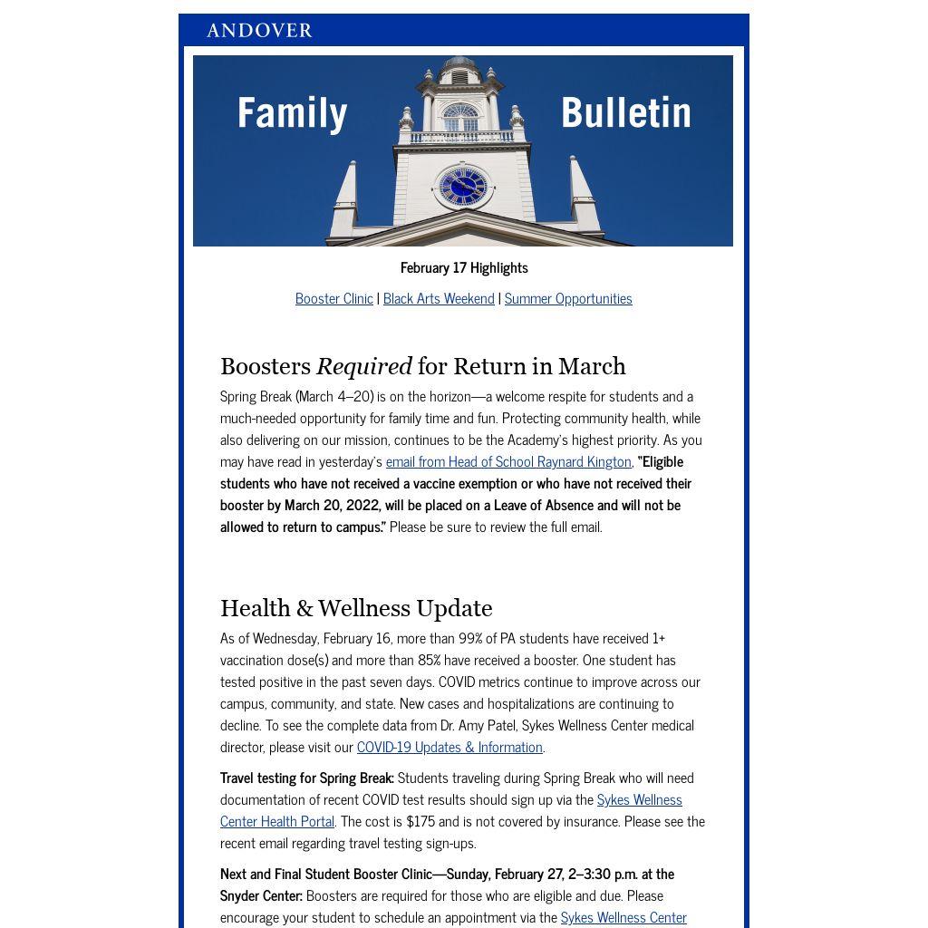 Spring Break (March 4–20) is on the horizon—a welcome respite for students and a much-needed opportunity for family time and fun. Protecting community health, while also delivering on our mission, continues to be the Academy’s highest priority. As you may have read in yesterday’s email from Head of School Raynard Kington, “Eligible students who have not received a vaccine exemption or who have not received their booster by March 20, 2022, will be placed on a Leave of Absence and will not be allowed to return to campus." Please be sure to review the full email.