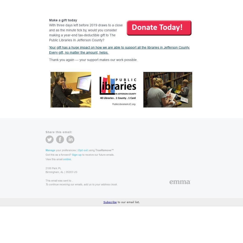 With three days left before 2019 draws to a close and as the minute tick by, would you consider making a year-end tax-deductible gift to The Public Libraries In Jefferson County?