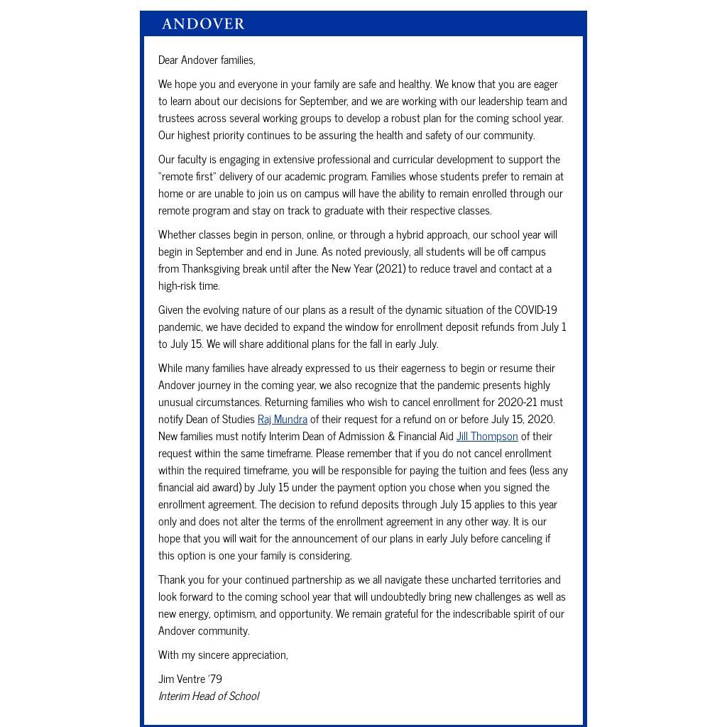 Thank you for your continued partnership as we all navigate these uncharted territories and look forward to the coming school year that will undoubtedly bring new challenges as well as new energy, optimism, and opportunity. We remain grateful for the indescribable spirit of our Andover community.