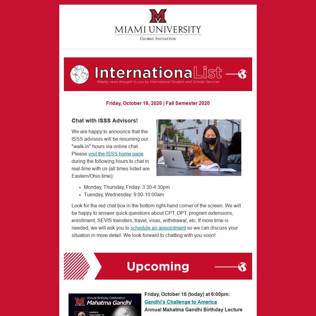 - Are you looking to distribute information about your event, program, group etc. to international students and scholars at Miami? Submit an ISSS communications request.