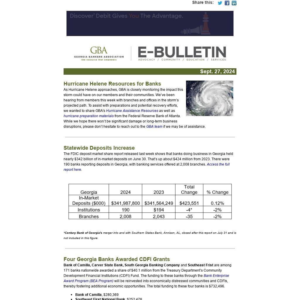 Hurricane Helene Resources for BanksAs Hurricane Helene approaches, GBA is closely monitoring the impact this storm could have on our members and their communities. We’ve been hearing from members this week with branches and offices in the storm’s projected path. To assist with preparations and potential recovery efforts, we wanted to share GBA’s Hurricane Assistance Resources as well as hurricane preparation materials from the Federal Reserve Bank of Atlanta. While we hope there won’t be significant damage or long-term business disruptions, please don’t hesitate to reach out to the GBA team if we may be of assistance.