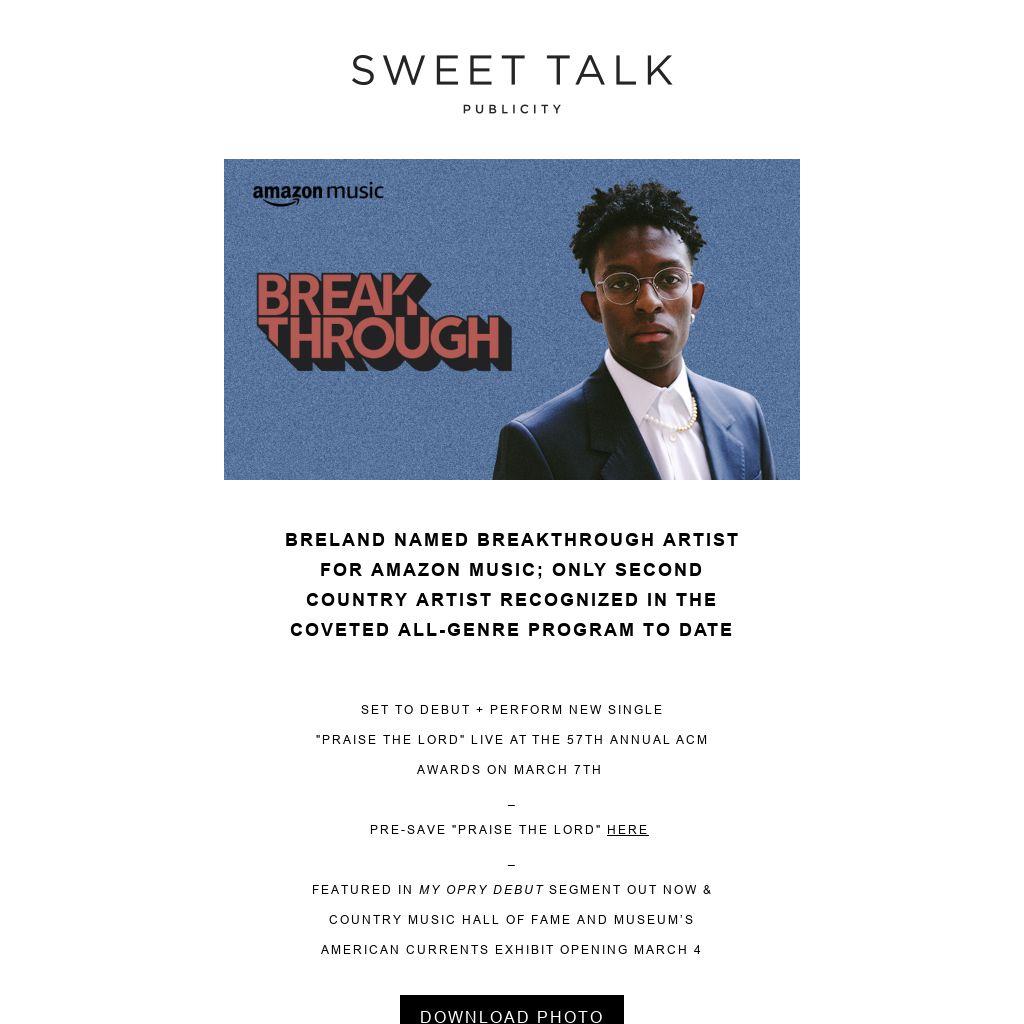 With his PLATINUM debut “My Truck,” singer/songwriter/producer BRELAND has emerged as a bold new force on today’s music landscape. The Hip-Hop and Country hybrid hit #1 on Spotify’s Global Viral 50 in 2019, and a remix featuring Sam Hunt landed on best-of-the-year lists from NPR and The New York Times. Having signed to Bad Realm Records/Atlantic Records, he has collaborated with heavy-hitters such as Gary LeVox of Rascal Flatts, Nelly, Blanco Brown, Lauren Alaina, and Chase Rice. The New Jersey native has notched several career milestones with high profile looks on The Kelly Clarkson Show, ABC’s CMA Summer Jam, CMT Crossroads, ABC’s Jimmy Kimmel Live!, ABC’s Good Morning America, YouTube’s Artist on The Rise, a Chevy campaign that launched during NFL’s season opener, and most recently named a Breakthrough Artist by Amazon Music. He recently enlisted Keith Urban for the dynamic collaboration “Throw It Back” and is currently featured on Dierks Bentley’s single with HARDY, “Beers On Me.” Praised by Rolling Stone as “1,000 percent the whole package,” he made his Grand Ole Opry debut to a standing ovation and will also be recognized in the Country Music Hall of Fame’s American Currents: State of the Music exhibit opening March 4.