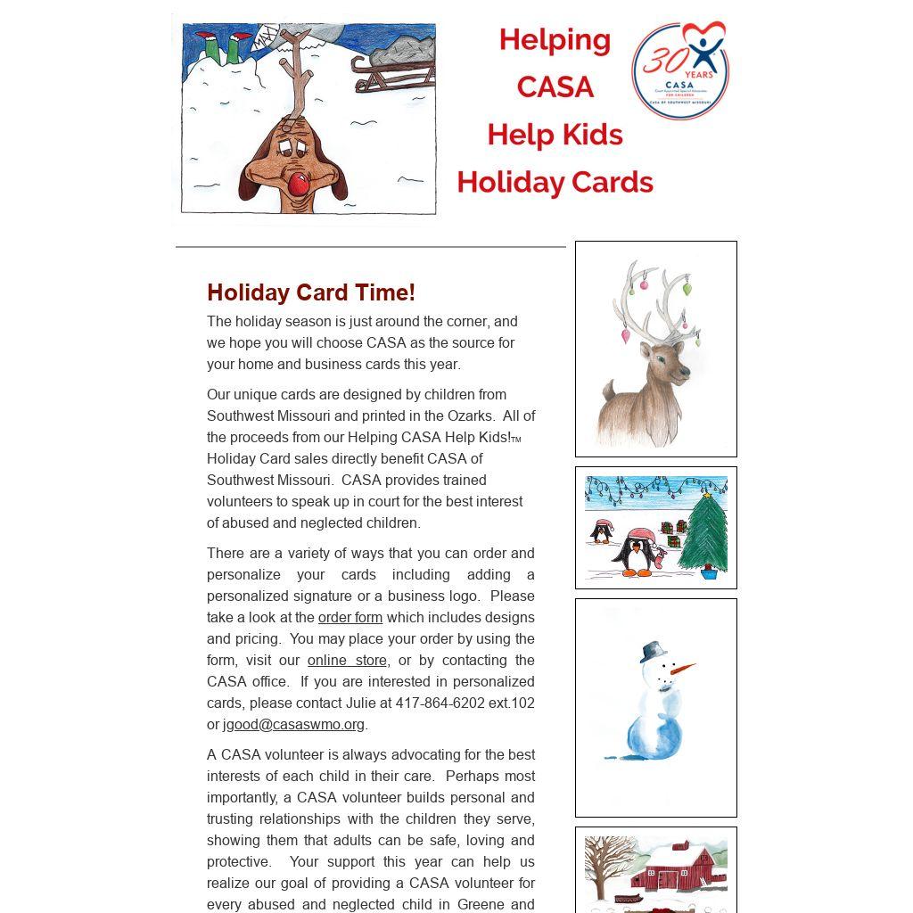 Our unique cards are designed by children from Southwest Missouri and printed in the Ozarks. All of the proceeds from our Helping CASA Help Kids!TM Holiday Card sales directly benefit CASA of Southwest Missouri. CASA provides trained volunteers to speak up in court for the best interest of abused and neglected children.