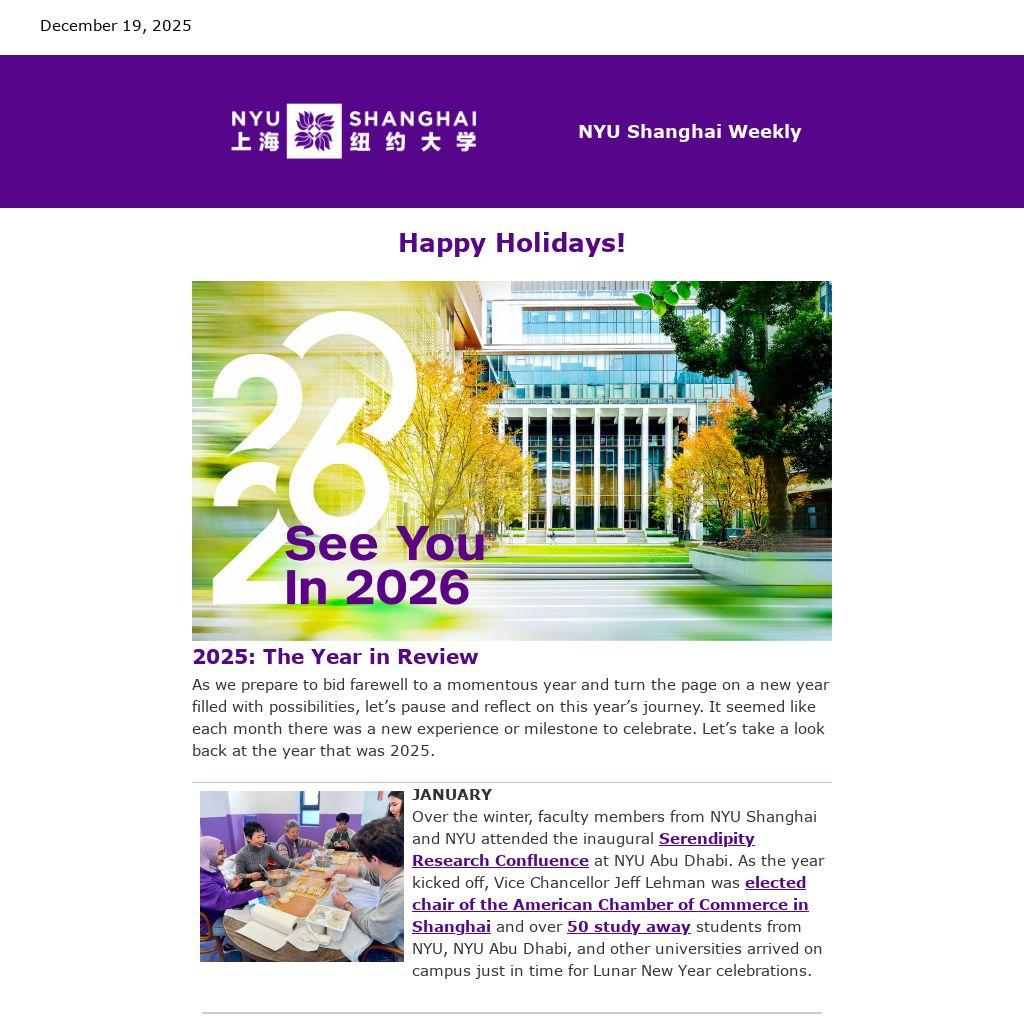 With the semester concluding, your NYU Shanghai Weekly is signing off for the holidays. We look forward to celebrating you and your achievements in the year to come. As always, keep sending your news items and story ideas to your friends at University Communications and the NYU Shanghai Weekly at shanghai.uc@nyu.edu. Enjoy a well-deserved break!