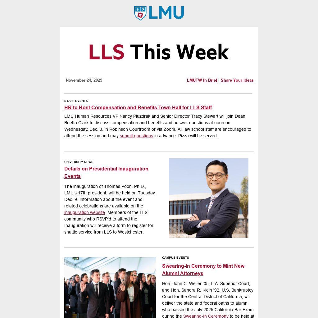 The inauguration of Thomas Poon, Ph.D., LMU’s 17th president, will be held on Tuesday, Dec. 9. Information about the event and related celebrations are available on the inauguration website. Members of the LLS community who RSVP’d to attend the Inauguration will receive a form to register for shuttle service from LLS to Westchester.