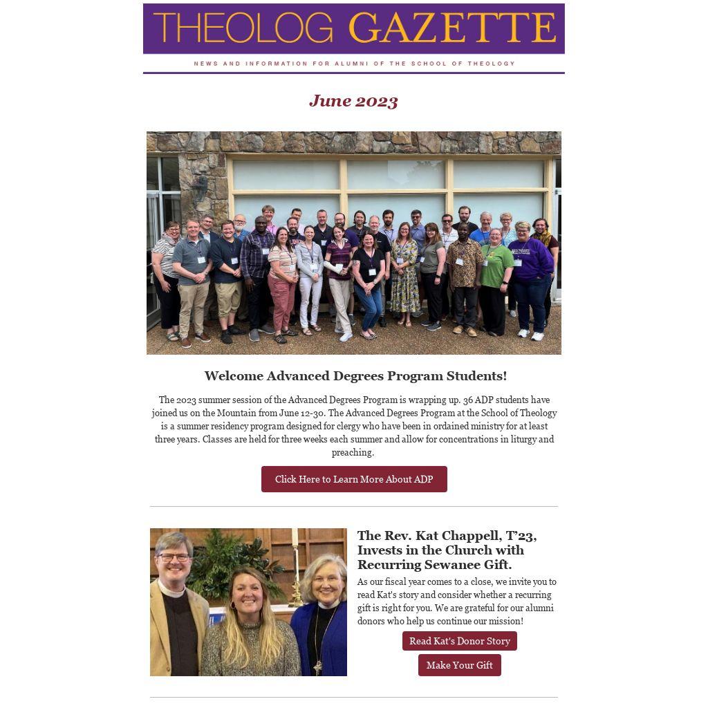 The 2023 summer session of the Advanced Degrees Program is wrapping up. 36 ADP students have joined us on the Mountain from June 12-30. The Advanced Degrees Program at the School of Theology is a summer residency program designed for clergy who have been in ordained ministry for at least three years. Classes are held for three weeks each summer and allow for concentrations in liturgy and preaching.
