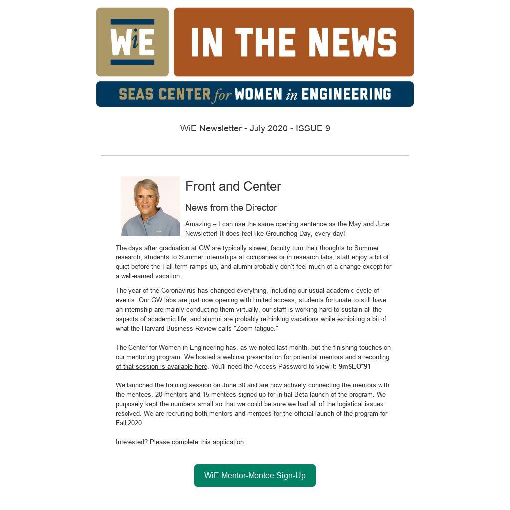 The Center for Women in Engineering has, as we noted last month, put the finishing touches on our mentoring program. We hosted a webinar presentation for potential mentors and a recording of that session is available here. You'll need the Access Password to view it: 9m$EO*91