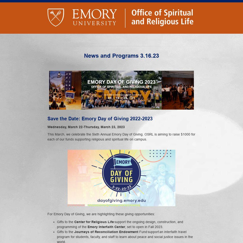 Emory OSRL ENews is published weekly during the term by the Emory University Office of Spiritual and Religious Life publicizing Atlanta-campus spiritual life programs. It is not a comprehensive listing. For Oxford College spiritual life, please click here. To submit information or to update your preferences, please contact religiouslife@emory.edu.