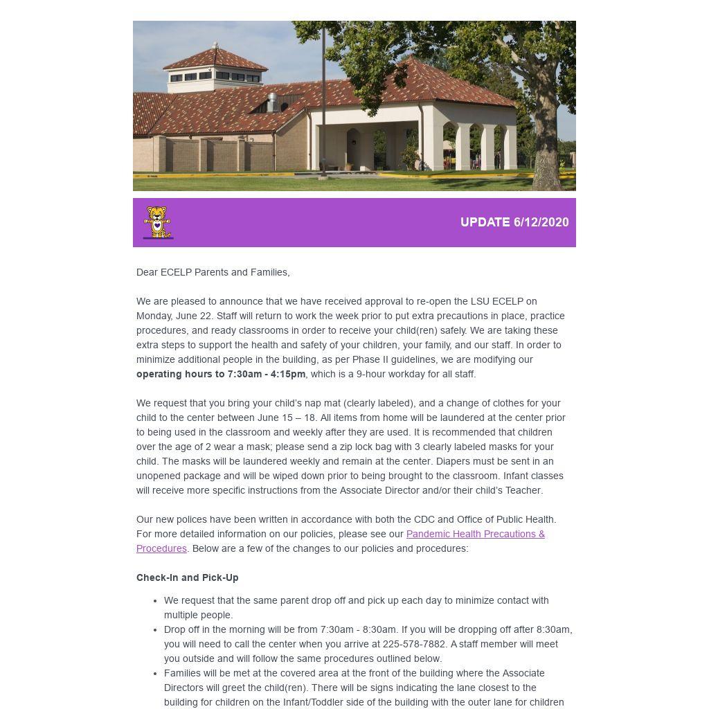 We are pleased to announce that we have received approval to re-open the LSU ECELP on Monday, June 22. Staff will return to work the week prior to put extra precautions in place, practice procedures, and ready classrooms in order to receive your child(ren) safely. We are taking these extra steps to support the health and safety of your children, your family, and our staff. In order to minimize additional people in the building, as per Phase II guidelines, we are modifying our operating hours to 7:30am - 4:15pm, which is a 9-hour workday for all staff.