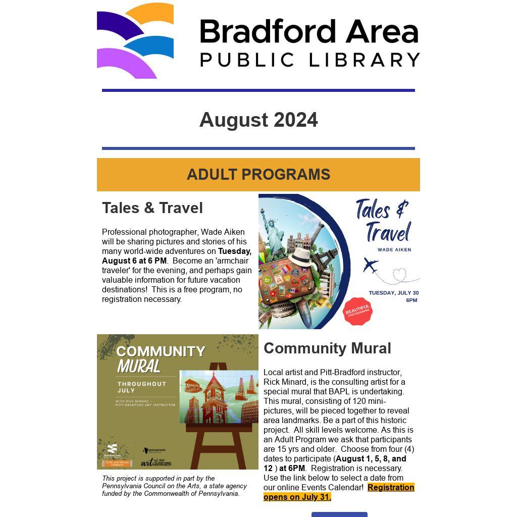Saturday, August 3 is our final Saturday Story Walk. Interested parties will find our story along the Pitt Trail from 9:30AM - 1PM. After the walk, we will meet at the library for a picnic. For more details, contact Miss Bonnie at 814-362-6527 or email program@bradfordlibrary.org