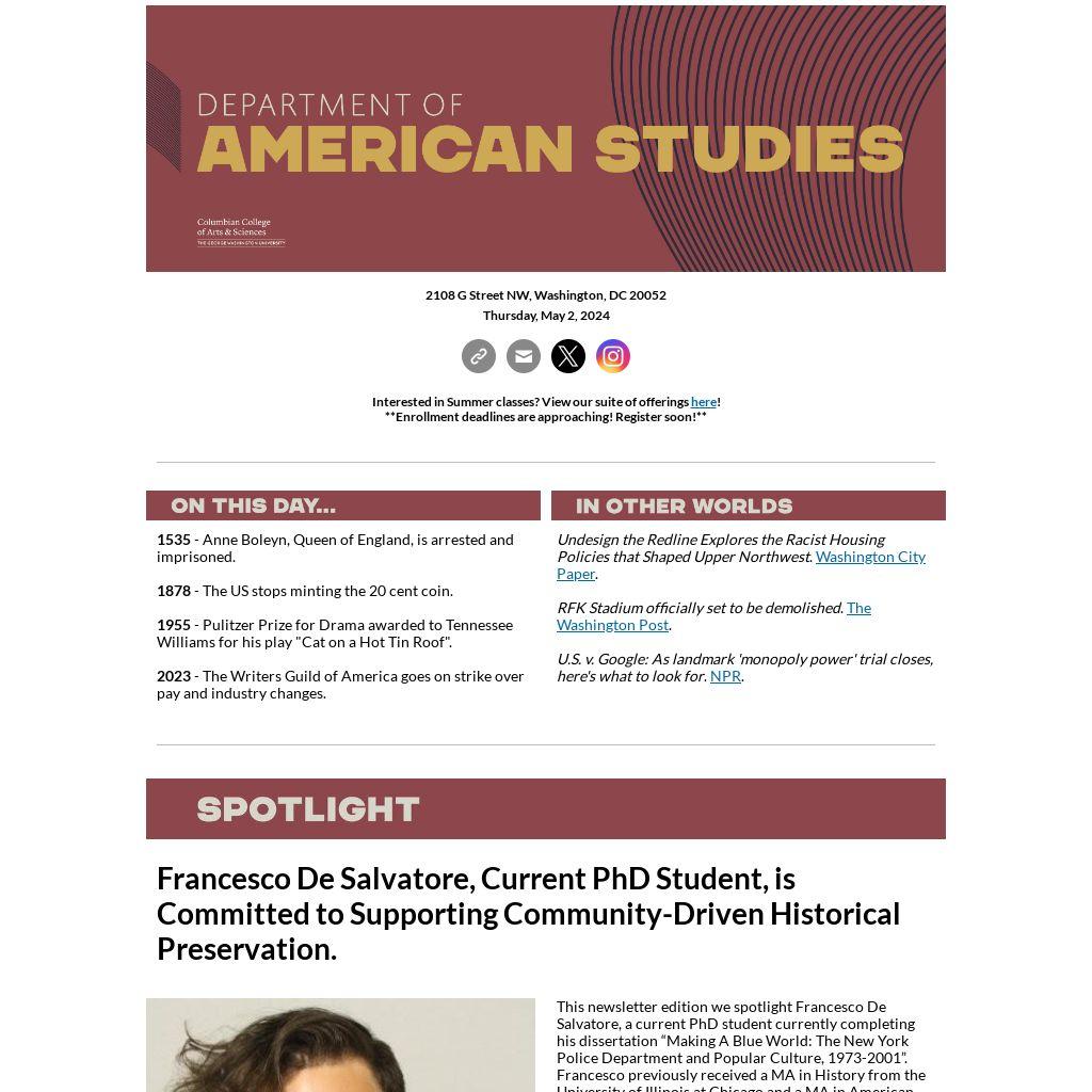 This newsletter edition we spotlight Francesco De Salvatore, a current PhD student currently completing his dissertation “Making A Blue World: The New York Police Department and Popular Culture, 1973-2001”. Francesco previously received a MA in History from the University of Illinois at Chicago and a MA in American Studies from GW.