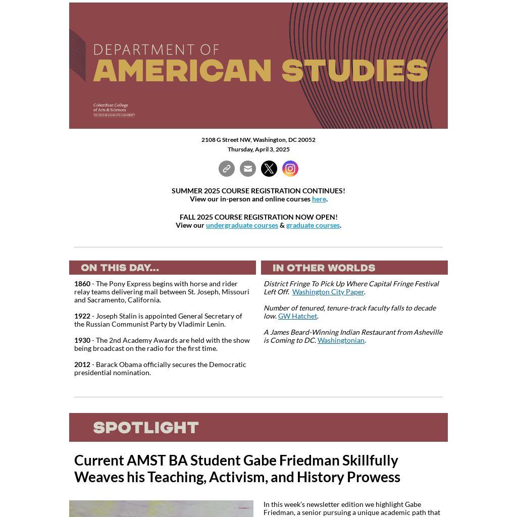 In this week’s newsletter edition we highlight Gabe Friedman, a senior pursuing a unique academic path that combines a joint BA/MA in American Studies with a STEM Teaching minor. A passion for cultural history, education, and social change shaped his educational journey. Gabe aspires to become a "cool" high school humanities educator after further studies in pedagogy, aiming to inspire his students with engaging narratives of American cultural history.