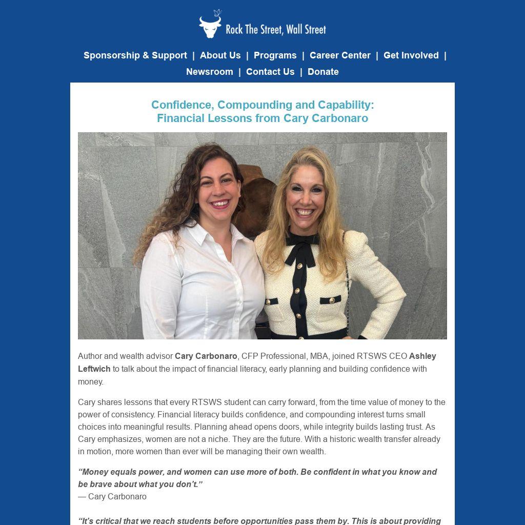 Author and wealth advisor Cary Carbonaro, CFP Professional, MBA, joined RTSWS CEO Ashley Leftwich to talk about the impact of financial literacy, early planning and building confidence with money.