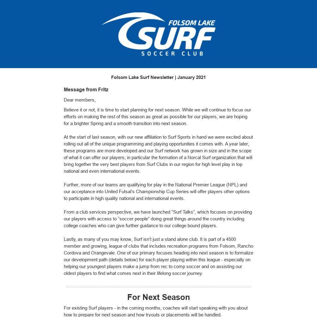 Lastly, as many of you may know, Surf isn’t just a stand alone club. It is part of a 4500 member and growing, league of clubs that includes recreation programs from Folsom, Rancho Cordova and Orangevale. One of our primary focuses heading into next season is to formalize our development path (details below) for each player playing within this league - especially on helping our youngest players make a jump from rec to comp soccer and on assisting our oldest players to find what comes next in their lifelong soccer journey.