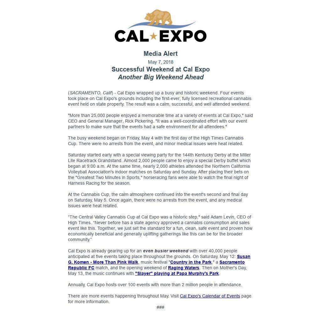 (SACRAMENTO, Calif) - Cal Expo wrapped up a busy and historic weekend. Four events took place on Cal Expo's grounds including the first-ever, fully licensed recreational cannabis event held on state property. The result was a calm, successful, and well attended weekend.