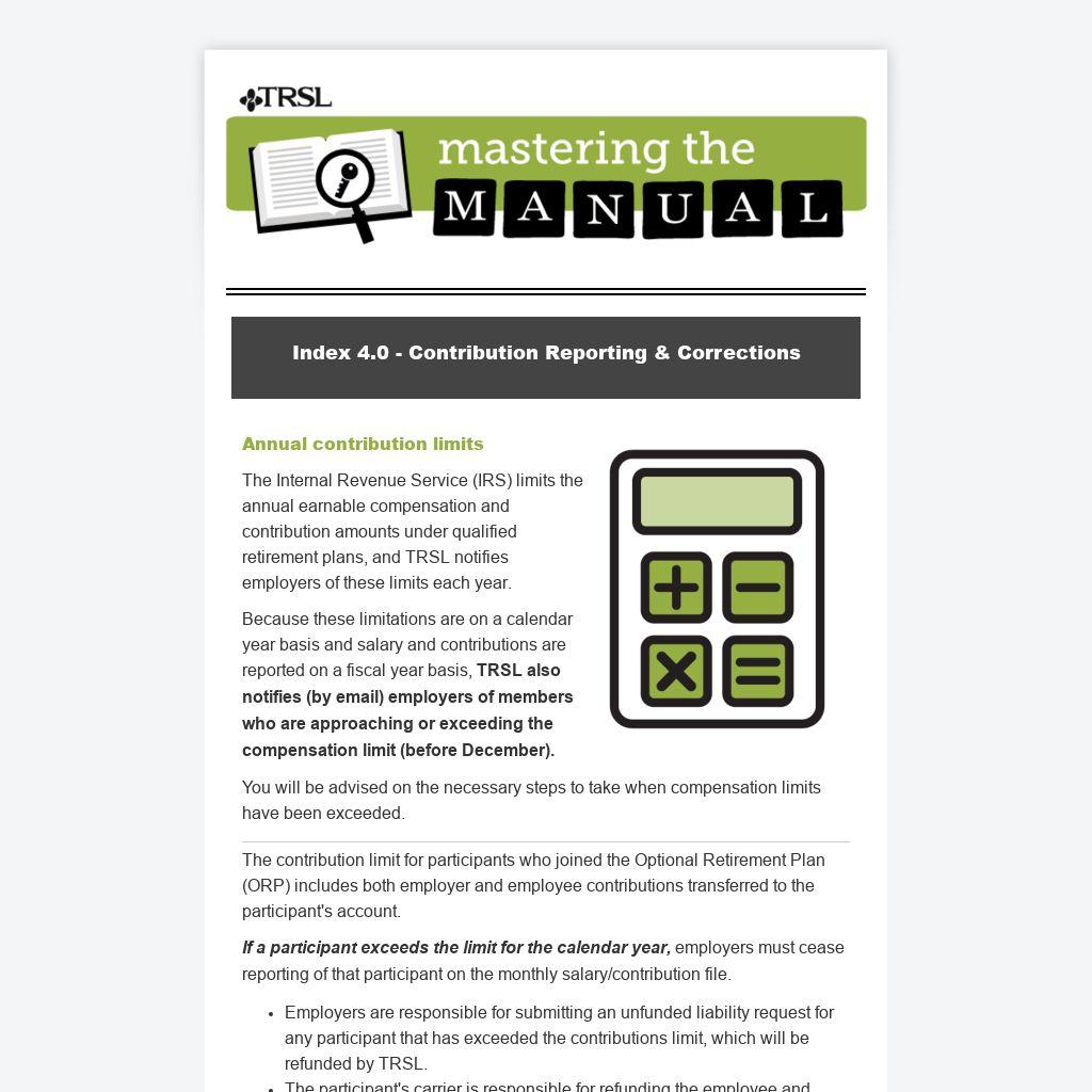Because these limitations are on a calendar year basis and salary and contributions are reported on a fiscal year basis, TRSL also notifies (by email) employers of members who are approaching or exceeding the compensation limit (before December).