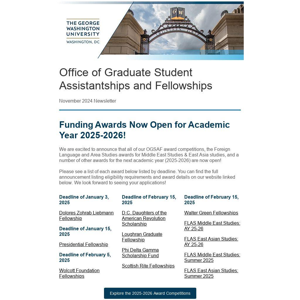 The Office of Graduate Student Assistantships and Fellowships serves as a resource for graduate students looking for funding opportunities at the George Washington University.