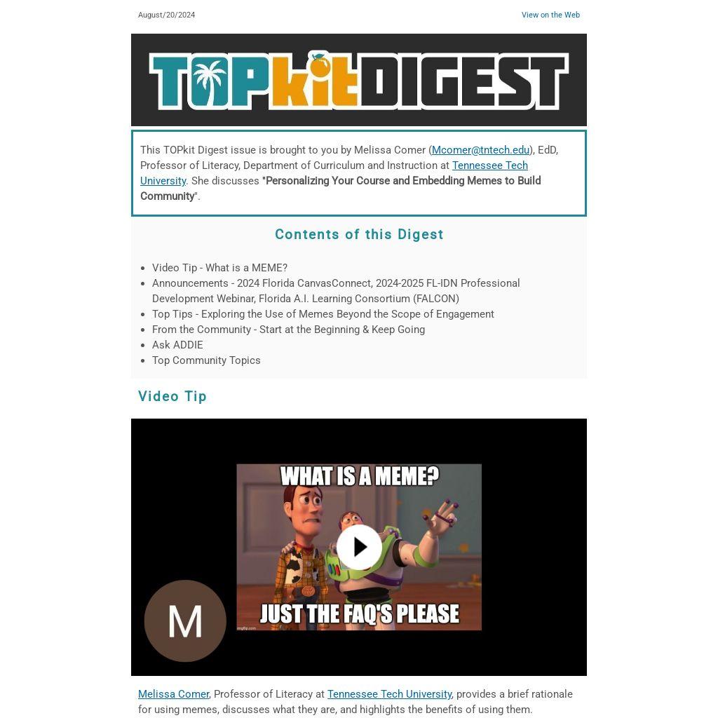 This TOPkit Digest issue is brought to you by Melissa Comer (Mcomer@tntech.edu), EdD, Professor of Literacy, Department of Curriculum and Instruction at Tennessee Tech University. She discusses "Personalizing Your Course and Embedding Memes to Build Community".