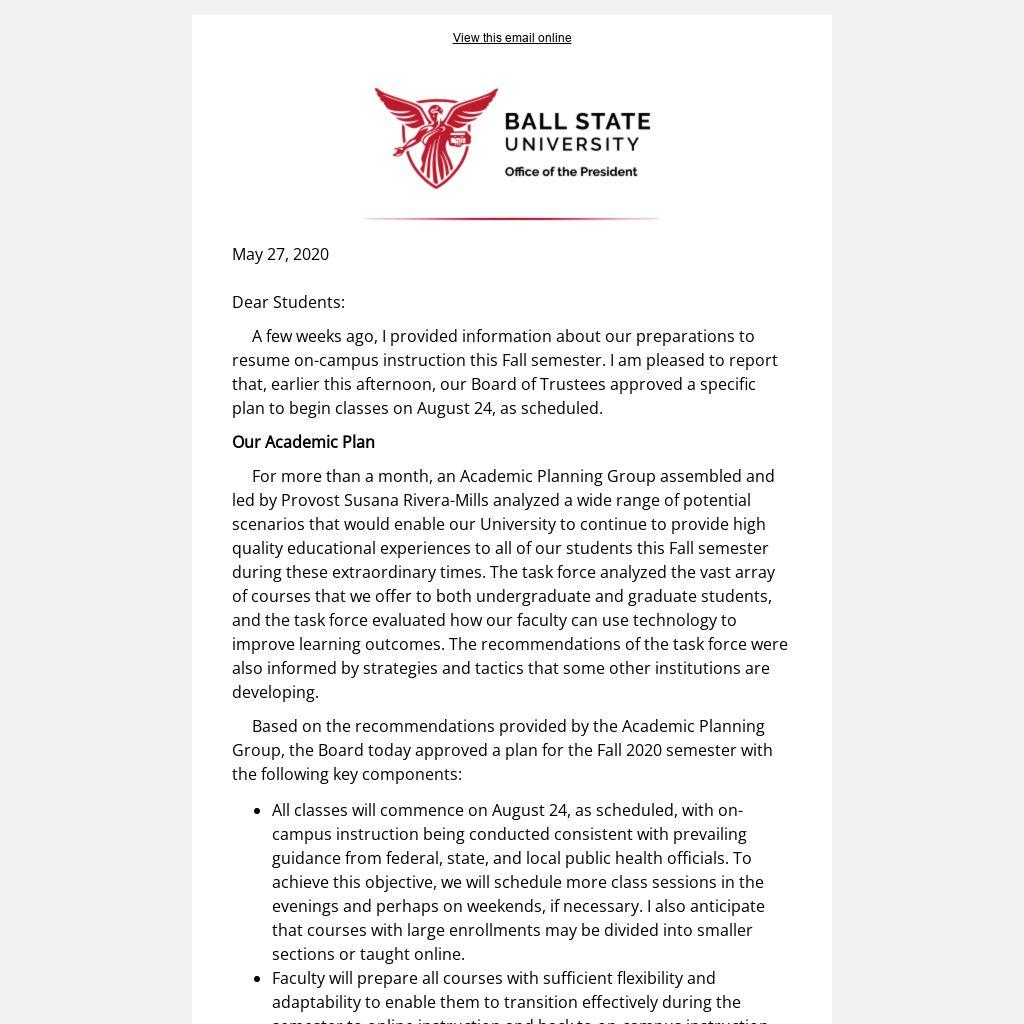 A few weeks ago, I provided information about our preparations to resume on-campus instruction this Fall semester. I am pleased to report that, earlier this afternoon, our Board of Trustees approved a specific plan to begin classes on August 24, as scheduled.