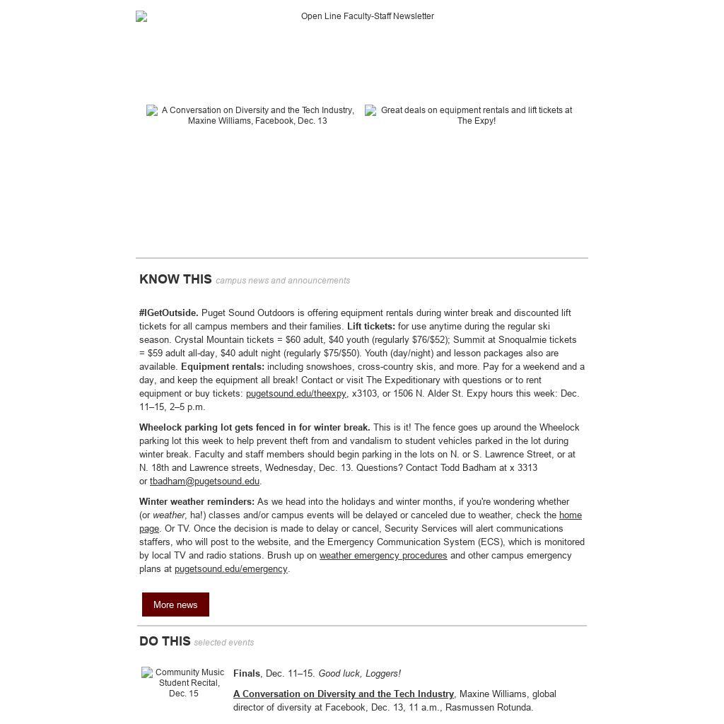 #IGetOutside. Puget Sound Outdoors is offering equipment rentals during winter break and discounted lift tickets for all campus members and their families. Lift tickets: for use anytime during the regular ski season. Crystal Mountain tickets = $60 adult, $40 youth (regularly $76/$52); Summit at Snoqualmie tickets = $59 adult all-day, $40 adult night (regularly $75/$50). Youth (day/night) and lesson packages also are available. Equipment rentals: including snowshoes, cross-country skis, and more. Pay for a weekend and a day, and keep the equipment all break! Contact or visit The Expeditionary with questions or to rent equipment or buy tickets: pugetsound.edu/theexpy, x3103, or 1506 N. Alder St. Expy hours this week: Dec. 11–15, 2–5 p.m. Wheelock parking lot gets fenced in for winter break. This is it! The fence goes up around the Wheelock parking lot this week to help prevent theft from and vandalism to student vehicles parked in the lot during winter break. Faculty and staff members should begin parking in the lots on N. or S. Lawrence Street, or at N. 18th and Lawrence streets, Wednesday, Dec. 13. Questions? Contact Todd Badham at x 3313 or tbadham@pugetsound.edu. Winter weather reminders: As we head into the holidays and winter months, if you're wondering whether (or weather, ha!) classes and/or campus events will be delayed or canceled due to weather, check the home page. Or TV. Once the decision is made to delay or cancel, Security Services will alert communications staffers, who will post to the website, and the Emergency Communication System (ECS), which is monitored by local TV and radio stations. Brush up on weather emergency procedures and other campus emergency plans at pugetsound.edu/emergency.