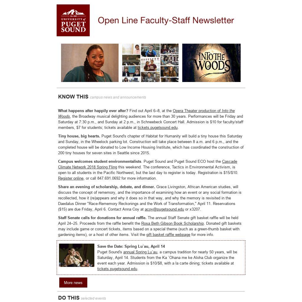 What happens after happily ever after? Find out April 6–8, at the Opera Theater production of Into the Woods, the Broadway musical delighting audiences for more than 30 years. Performances will be Friday and Saturday at 7:30 p.m., and Sunday at 2 p.m., in Schneebeck Concert Hall. Admission is $10 for faculty/staff members, $7 for students; tickets available at tickets.pugetsound.edu. Tiny house, big hearts. Puget Sound's chapter of Habitat for Humanity will build a tiny house this Saturday and Sunday, in the Wheelock parking lot. Construction will take place between 8 a.m. and 6 p.m., and the completed house will be donated to Low Income Housing Institute, which has coordinated the construction of 200 tiny houses for seven sites in Seattle since 2015.